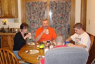 Me, Greg, Parker and the back of Coleson enjoying a very Southern breakfast prepared by my brother-in-law Robert.