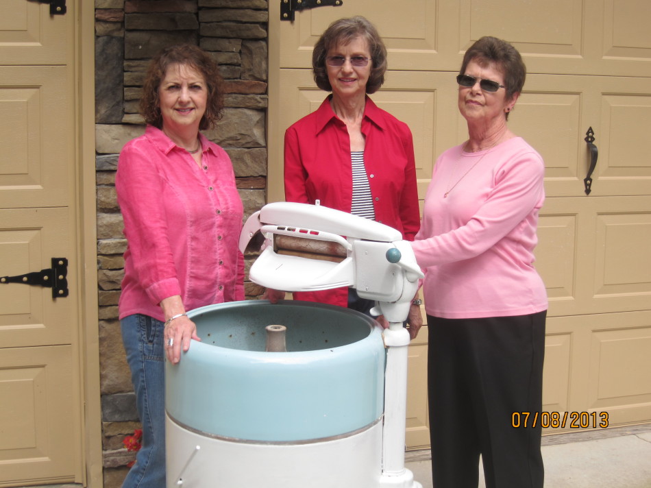 {#203} – Family – My mother has 5 brothers and 2 sisters. One of the brothers, Bill Parker, refurbished their mother’s old wringer washing machine. Bill’s wife, Pat, plans to use it as a planter in their yard, but before they did, Bill wanted to take a picture of all three sisters with the washing machine. All the kids remember Grandmother using the machine. I sent my camera along and asked them to get a pic with my camera of the girls with the machine.