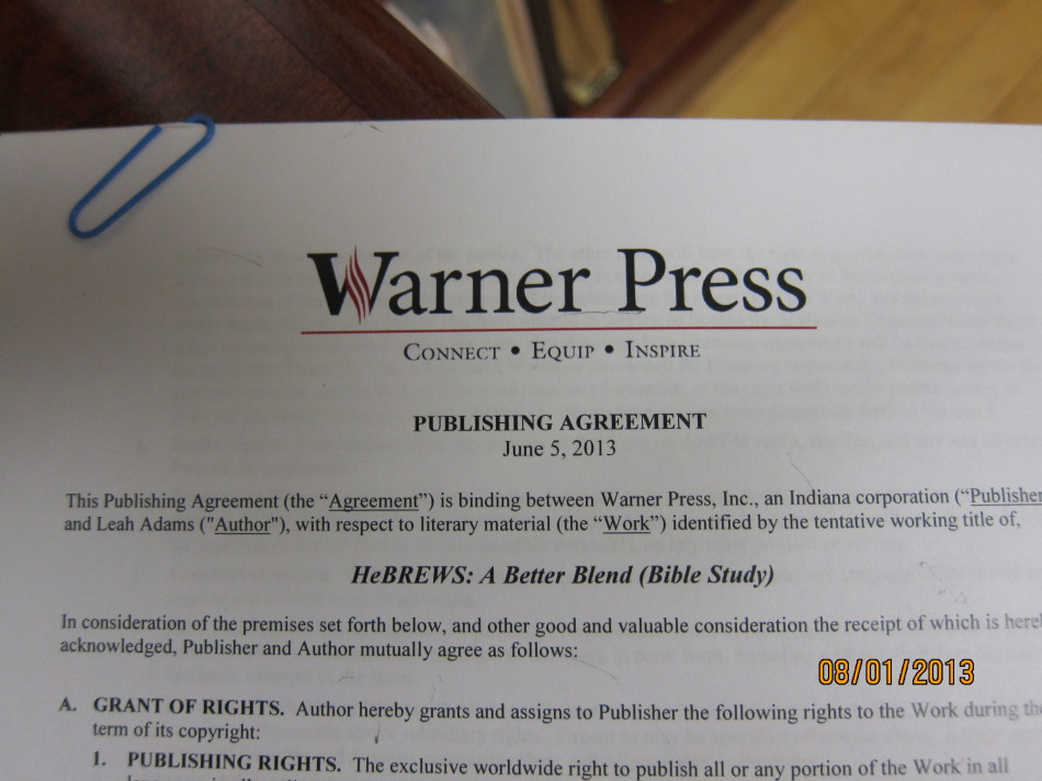 In case you can’t read it, it is a contract from Warner Press Publishing Company to publish the HeBrews Bible study. May I tell you that I am still stunned over this, although it has been in the works for about 7 months? When I began writing the HeBrews study, I had no plans to publish it. NONE!! I had already decided that I wouldn’t go the self-publishing route again like I had done with the Legacy study. It is so expensive, and I just did not sense the Lord telling me to travel that path. I began writing HeBrews simply out of obedience to the Lord. He said write and I said, “Yes sir.” I assumed I would take my Tuesday small group through it, and then put it on the shelf to collect dust. Well, the Lord had other plans. My sweet friend, Brooke Keith, connected me with the wonderful team at Warner Press and the rest is history. I will be sending my final manuscript to them by September 1st.  A June 2014 release is planned. This is a path that only Jesus could have orchestrated and I give Him praise for it.
