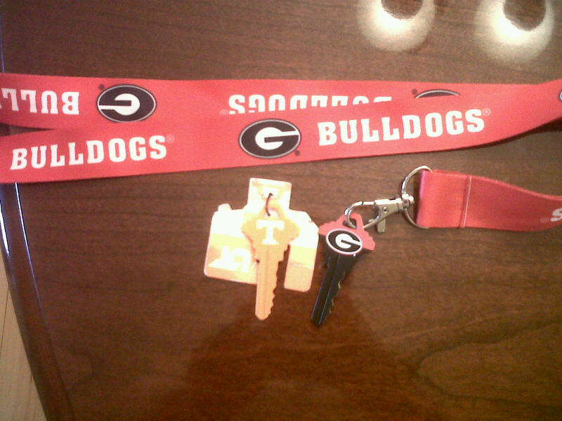 My man has such a funny sense of humor. At one of the pharmacies I work, the owners are Tennessee fans. So, they gave me a door key that was a Tennessee key. I took it home and showed it to Greg and he declared that it I could not bring that into our house. So, he goes to Home Depot and has a new key made–a Georgia key complete with lanyard. I gave it to my boss and his words were—‘probably won’t work’. What a hoot!!
