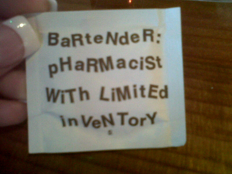 Greg and I stopped at Hooters (no we don’t regularly go there) to eat recently and I found this wet nap on our table. Thought it was a scream and had to take a pic since I am a pharmacist! Maybe if pharmacy and ministry go bust I could be a bartender?????