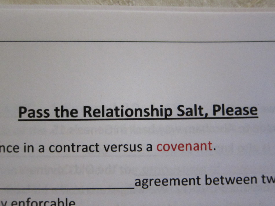 We had four couples, in addition to Greg and me, attend. Each came eager to hear from the Lord. We started with dinner (a Mexican feast) and fellowshipping at 6pm. I had two precious young ladies, Kelsey and Megan, who helped me in the kitchen, which blessed me and freed me up to focus on teaching.  By 6:40pm I was teaching the covenant material. We took a break around 7:30 and then finished around 8:30. There was a ton of material to cover and I took great pains to make sure everyone ‘got’ the material. I began with the covenant God made with Noah and worked my way through 8 covenants, ending with the friendship covenant between Jonathan and David and finally the Marriage Covenant. After I finished teaching each couple had an opportunity to move to a private space where they shared the Salt Covenant Ceremony between the two of them. Each attendee was given a marriage covenant bookmark and the opportunity to take the salt they used in the salt covenant ceremony home as a souvenir.
