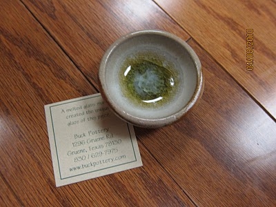 This adorable handmade bowl has been fashioned with a melted marble in the center. It is perfect for medications or to hold small pieces of jewelry, such as rings. It is from Buck Pottery in Gruene, Texas.